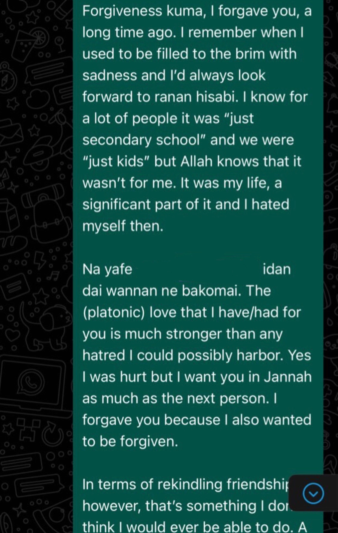 To victims of bullying and harassment: you're seen and understood. Forgiveness is a personal choice, and not forgiving is valid too.
